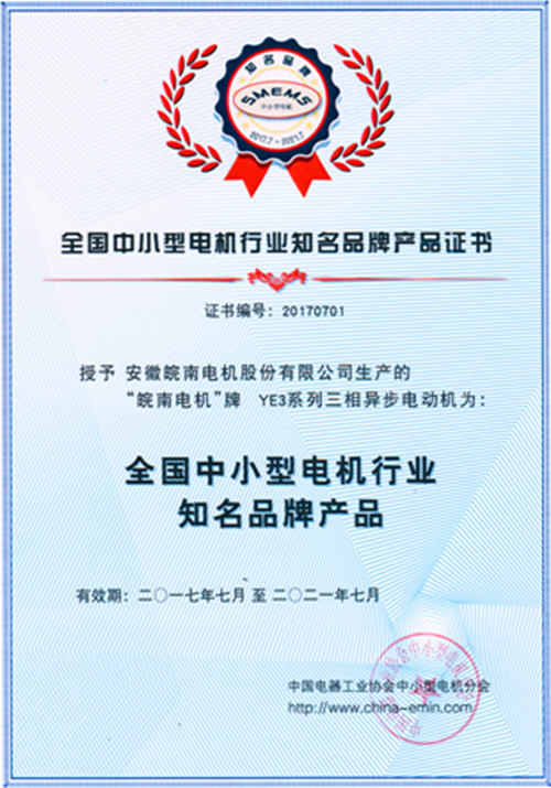 皖南電機(jī)榮獲 “全國(guó)中小型電機(jī)行業(yè)知名品牌產(chǎn)品”稱號(hào)